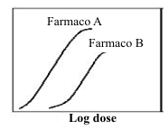 1753. I due farmaci A e B mostrano le curve dose-effetto in figura. Quale delle affermazioni sotto elencate è corretta: il farmaco A rispetto al farmaco B